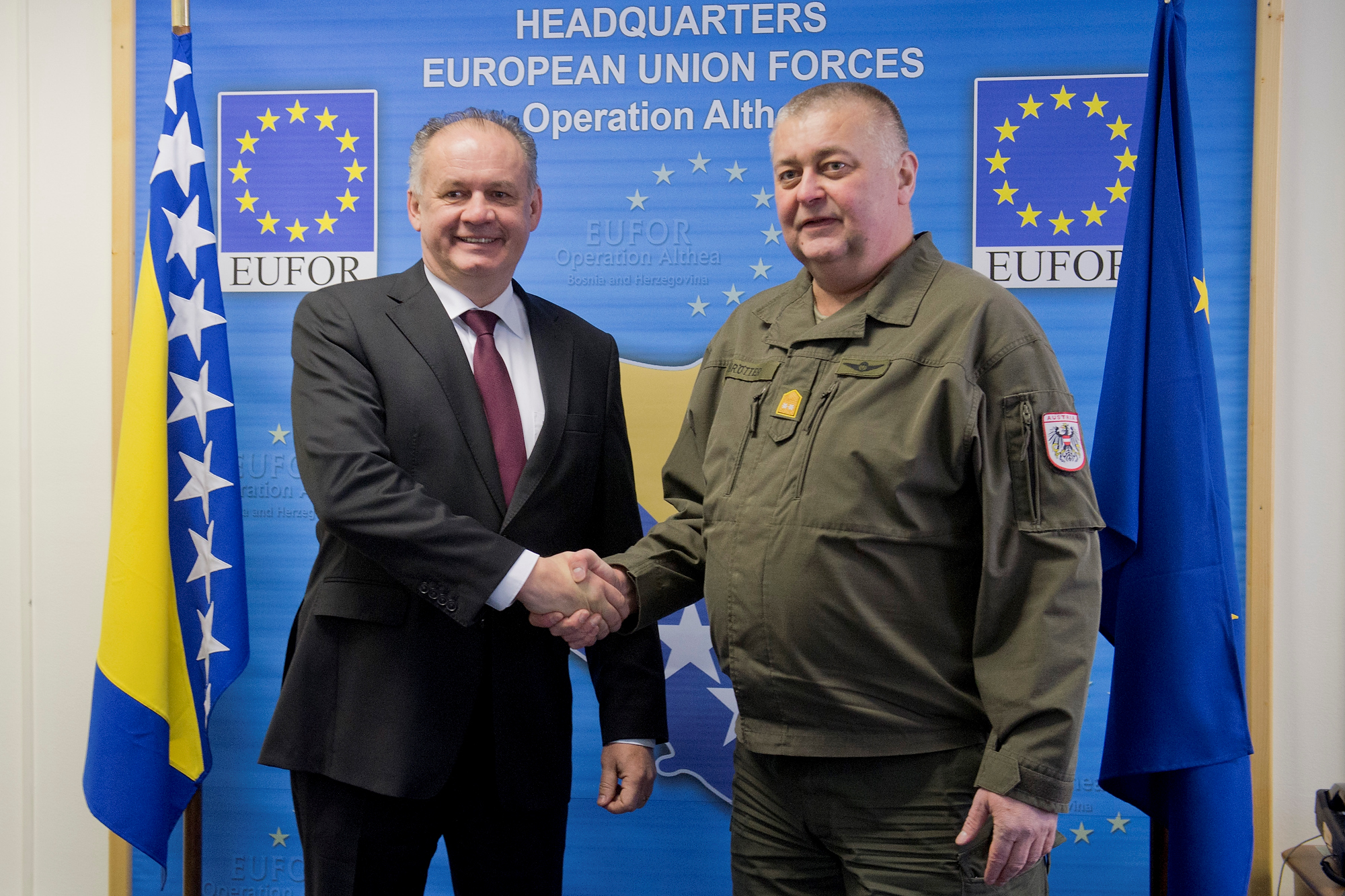 Prezident Andrej Kiska navštívil v utorok vojakov slovenského kontingentu pôsobiaceho v operácii EUFOR-ALTHEA v Bosne a Hercegovine. Stretol sa aj s veliteľom operácie EUFOR Friedrichom Schrὃtterom.