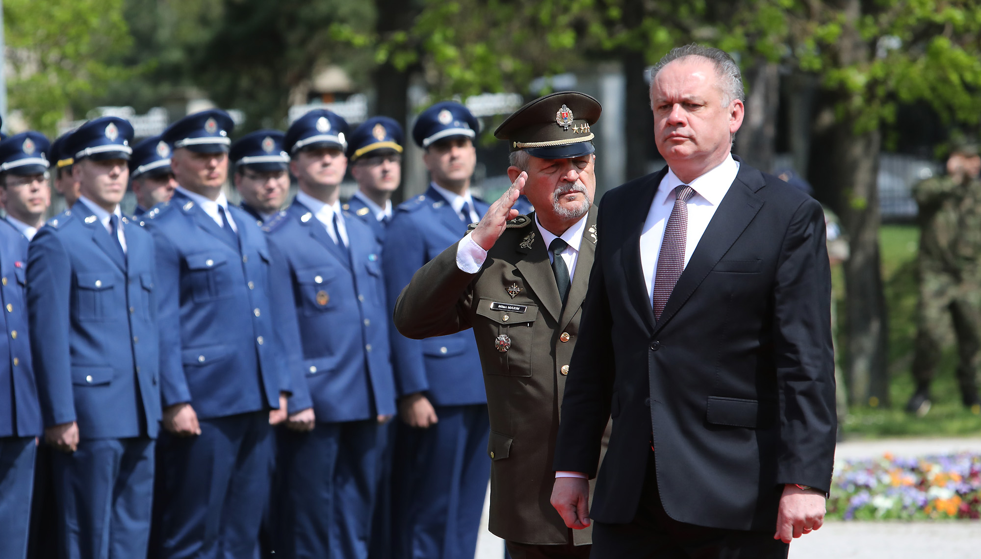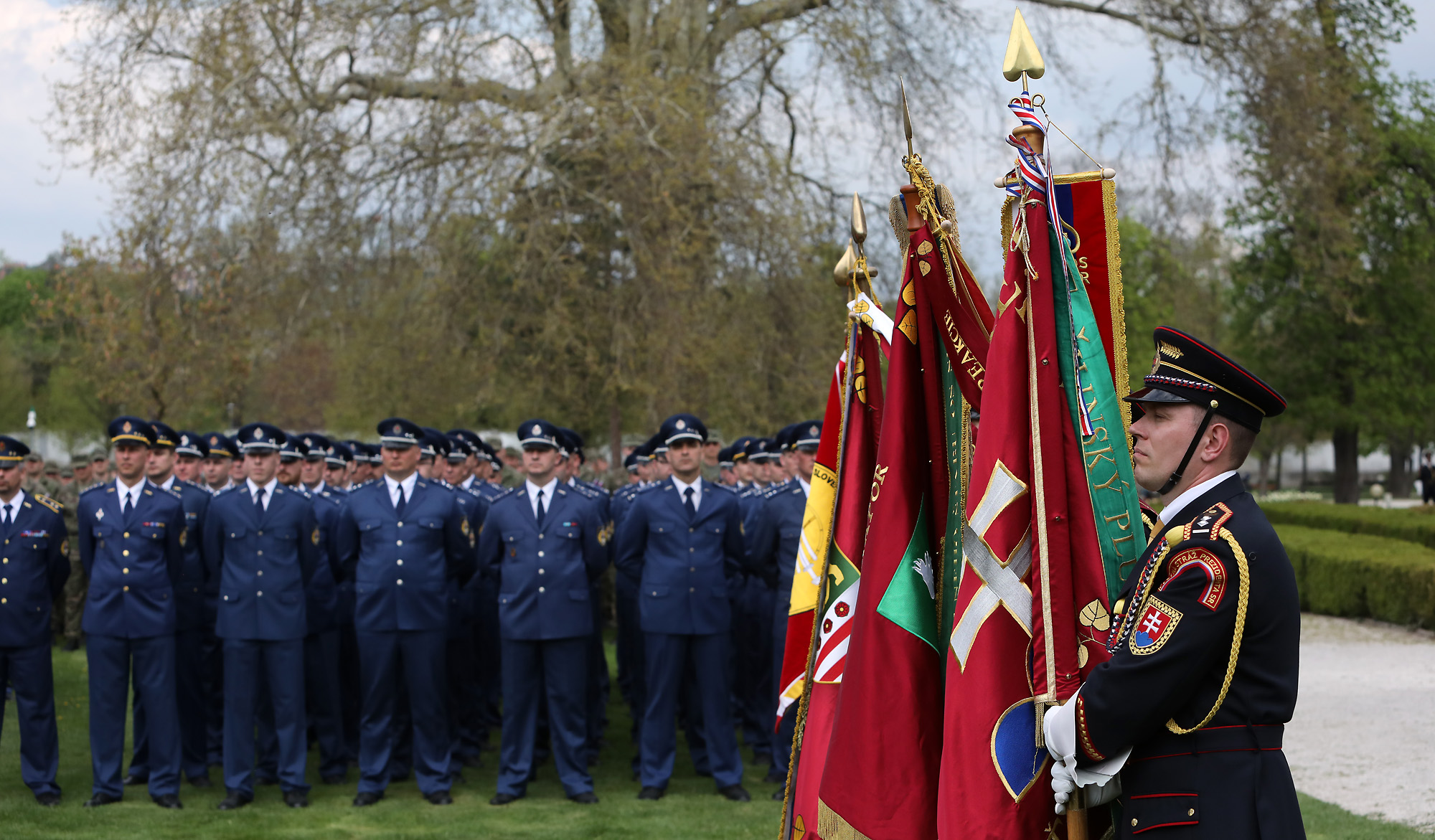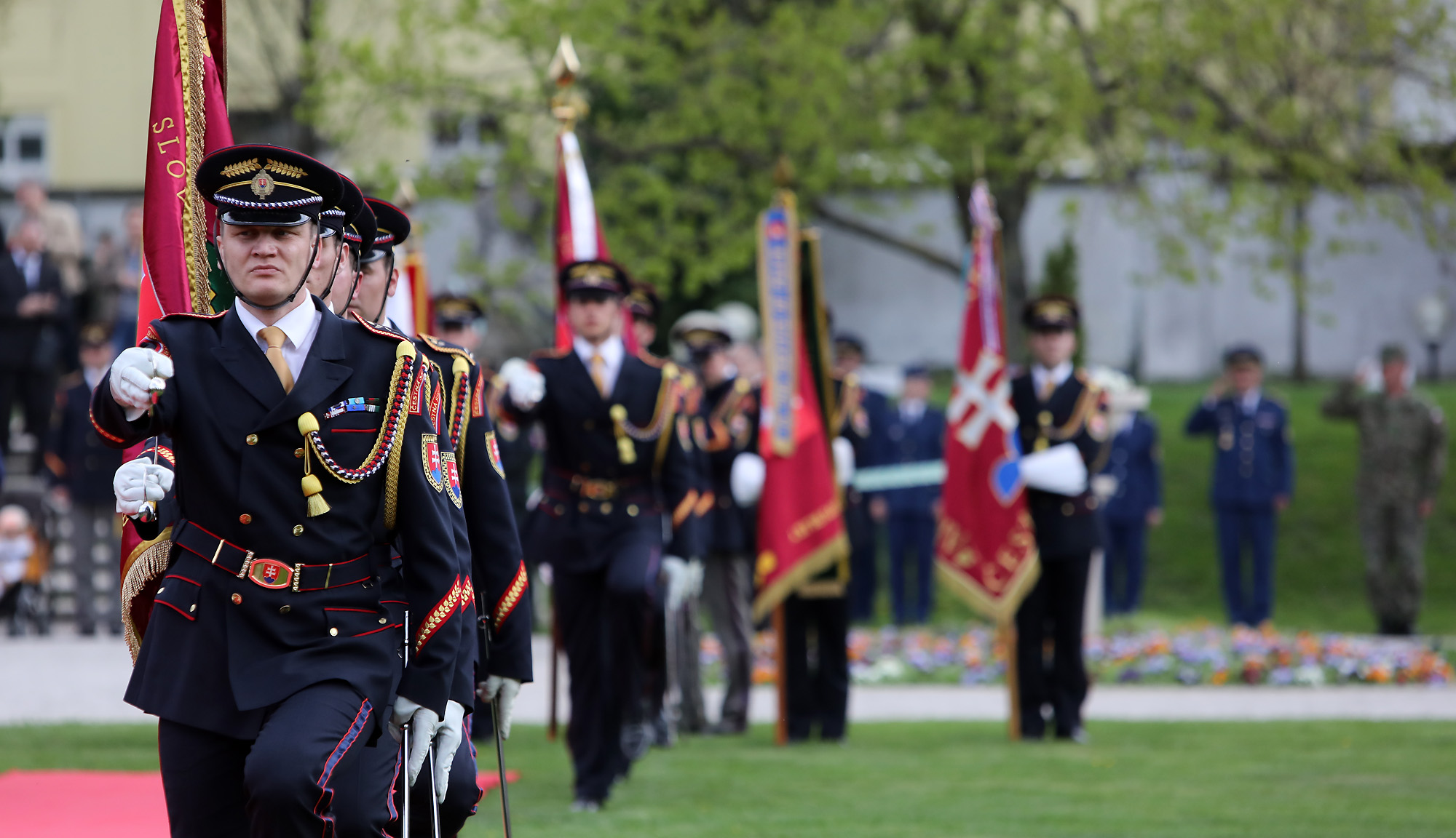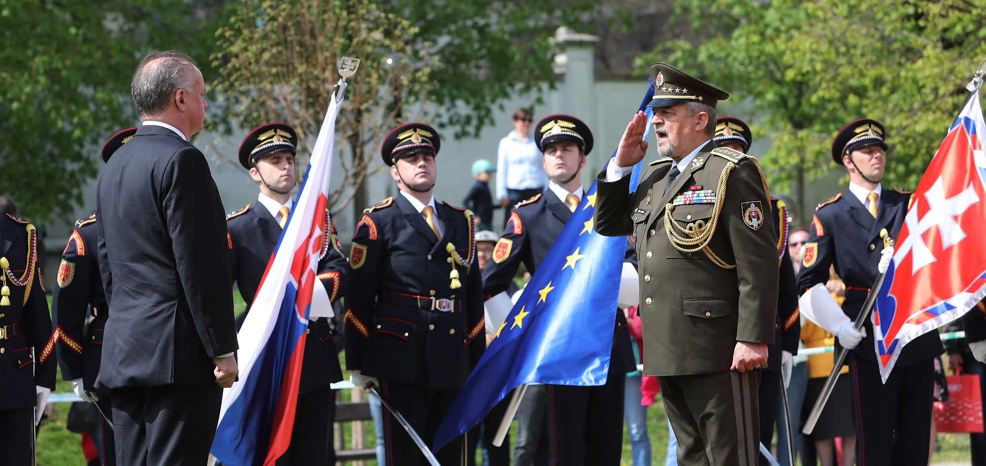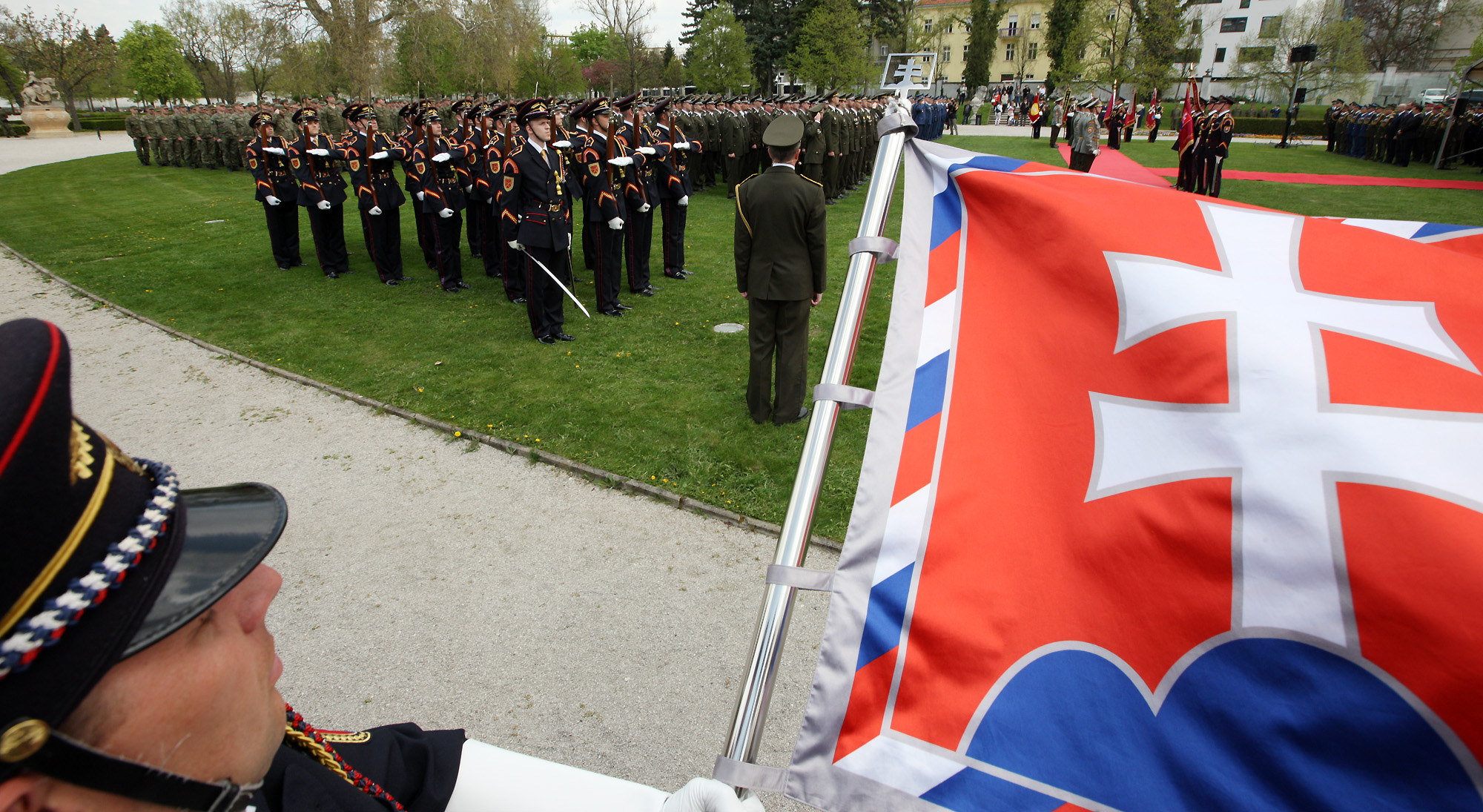 K zapožičaniu bojových zástav Vám — vojaci a vojačky Protilietadlovej raketovej brigády Nitra a Ženijného práporu Sereď — srdečne blahoželám.“