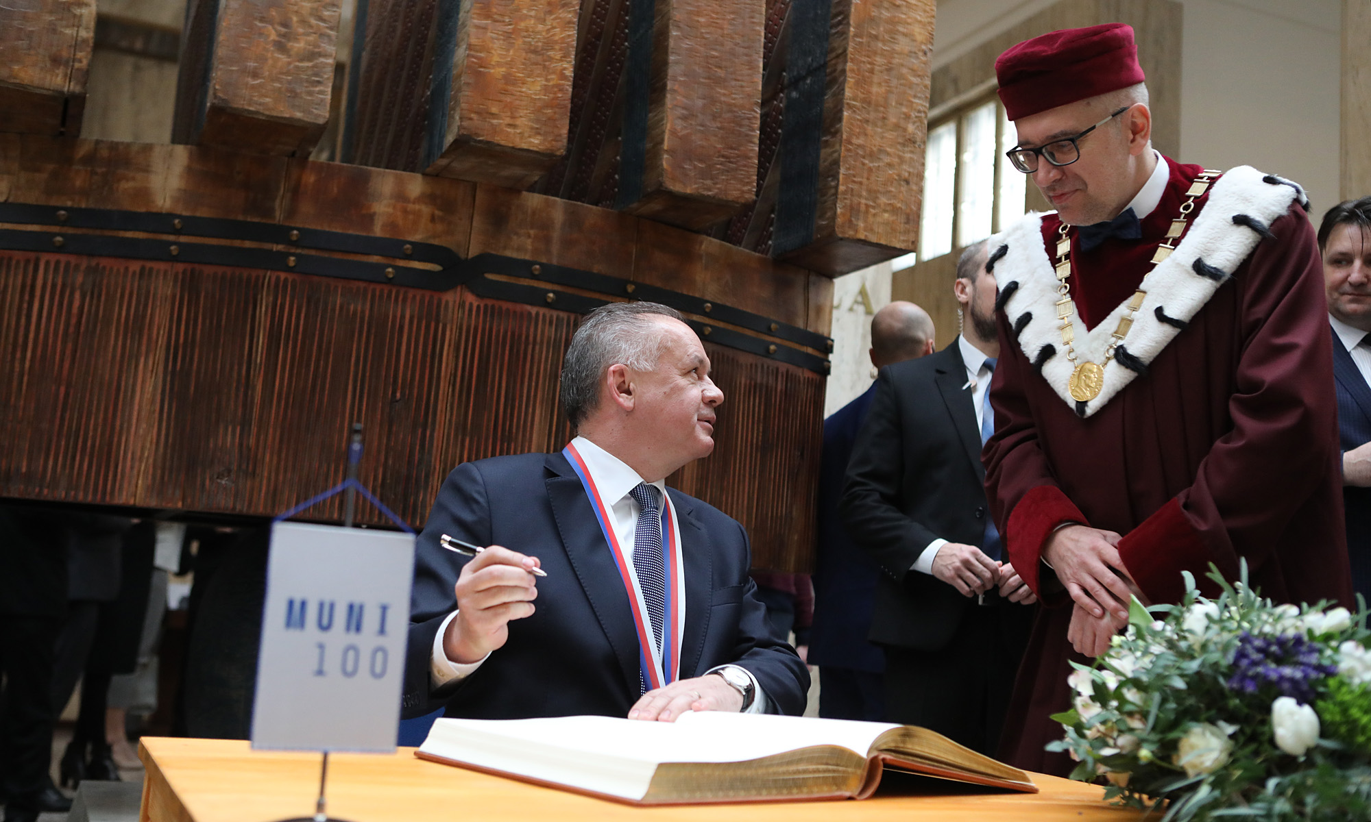 Prezident Andrej Kiska si v utorok v Brne prevzal Veľkú zlatú medailu Masarykovej univerzity, ktorú mu odovzdal pri príležitosti 100. výročia založenia univerzity jej rektor Mikuláš Bek. Slovenský prezident podľa neho prispel k uchovávaniu masarykovskej a štefánikovskej tradície v českej a slovenskej politike.