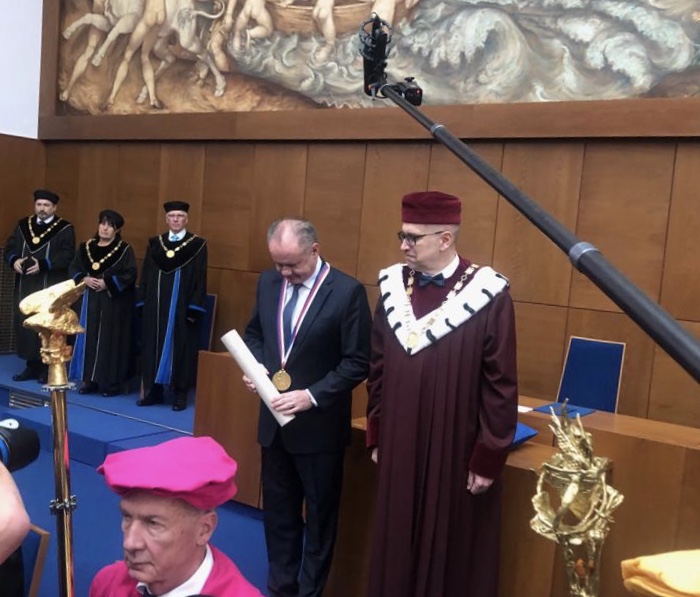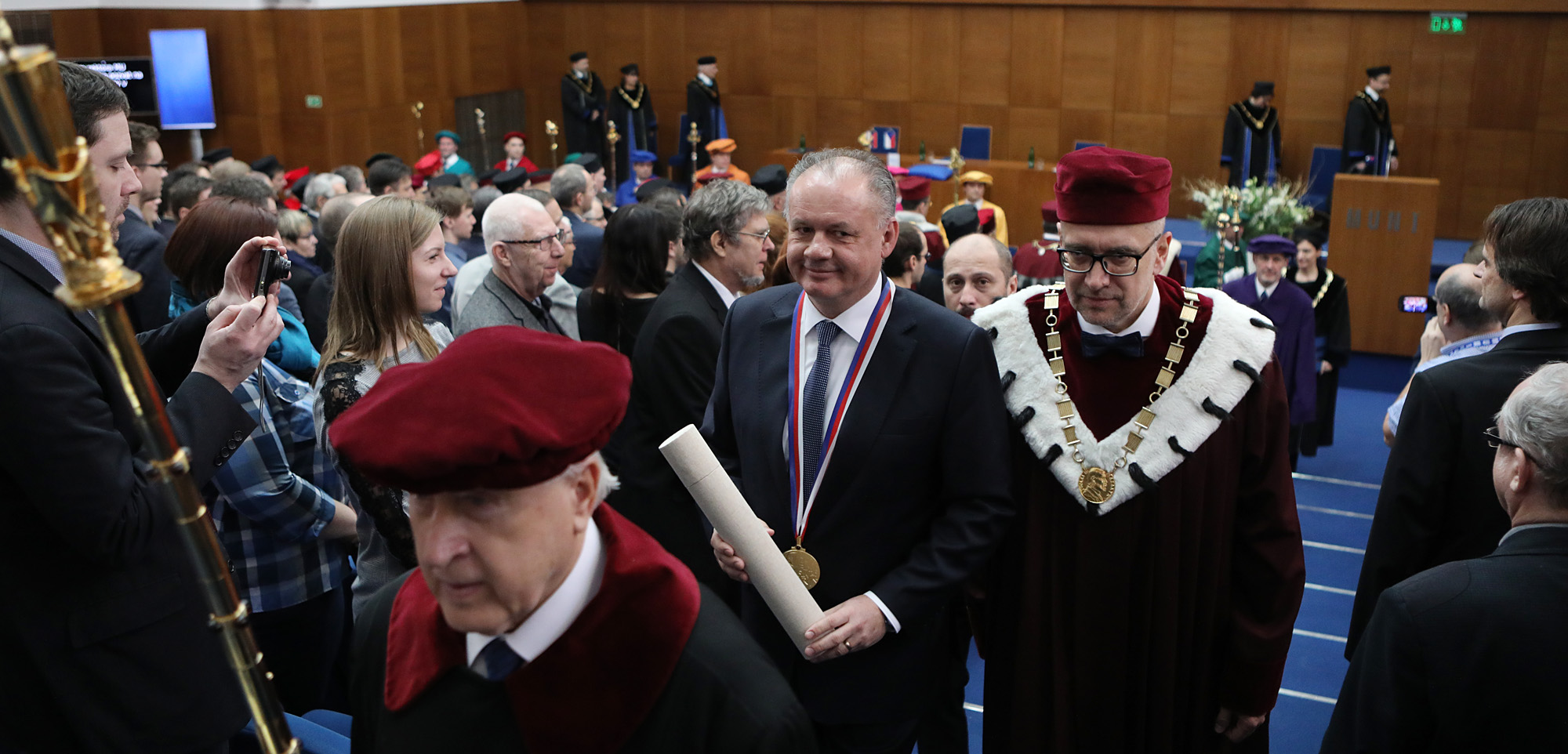 Na Slovensku často trochu s nadsázkou opakujem, že tretinu vysokých škôl by som okamžite zavrel a peniaze investoval do kvalitných vysokých škôl. Škôl s kvalitou presne ako je táto. A rád by som zložil poklonu tunajším pedagógom, manažérom a podporovateľom univerzity za vašu prácu. Za napĺňanie Masarykovho odkazu o potrebe vzdelania. Ďakujem vám. Aj ako prezident Slovenskej republiky, pretože aj mnohí absolventi vašej univerzity prispeli k tomu, že Slovensko je moderná, úspešná a sebavedomá krajina. Aké máme dnes školstvo, tak budú naše krajiny vyzerať o 20, o 30 rokov. A vrátiť úctu a rešpekt k pedagogickému povolaniu pokladám u nás doma za základnú prioritu našej krajiny. Nikdy neodhováram našich študentov, aby nešli študovať do zahraničia. Naopak, vyzývam ich, aby išli za najlepším vzdelaním aj na kraj sveta. Ale vždy ich prosím, aby sa nezabudli vrátiť, pretože naše nádherné krajiny týchto úžasných mladých ľudí potrebujú ako soľ.