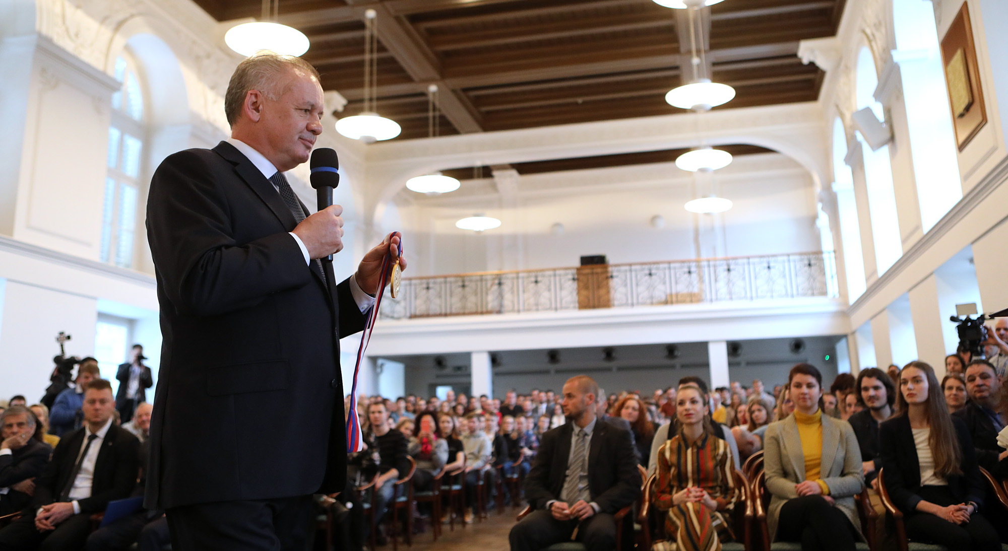 Keď som sa dozvedel, že sa mi dostane cti vkročiť do tejto auly, vybavilo sa mi nielen to, že tu študuje skoro 5300 slovenských študentov a že viacerí z nich stážovali v prezidentskom úrade. Ale aj to, čo som za posledných päť rokov o Masarykovej univerzite počul. A prečo sa tu dnes cítim tak trochu ako doma. Cestujem po Slovensku, stretávam sa s mladými ľuďmi, so študentmi gymnázií a ďalších stredných škôl. Vždy sa ich pýtam, čo by chceli v živote robiť, kde by chceli ďalej študovať. Verte tomu, že Masarykova univerzita vysoko boduje — kvalitou vzdelávania, technickým vybavením, špičkovou vedou.
